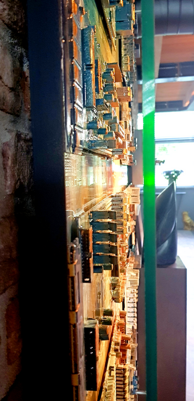 Foto achter glas op afstand gemonteerd op hout met computeronderdelen, gekleurd en afgewerkt met epoxyhars.